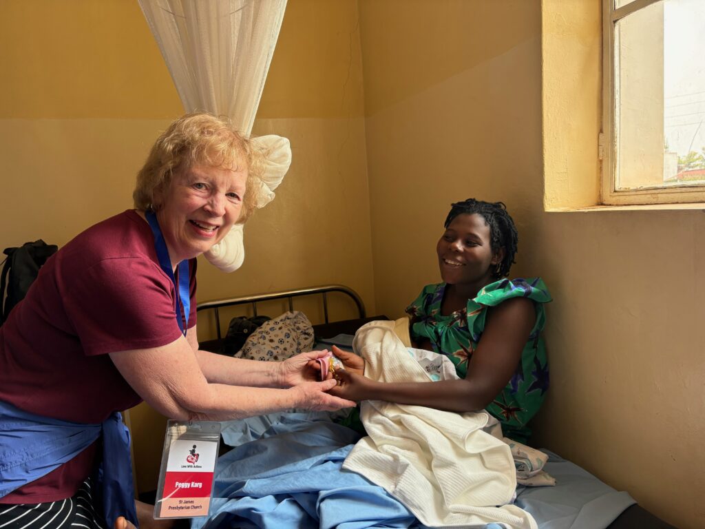 My favorite part of our visit was stopping by the postpartum room. We met two new moms and their baby boys born last night. We gave the clap and cheer for congratulations. As we peeked at these tiny newborn faces, Gilbert’s wife, Esther whispered to us that when you meet a new baby for the first time, it is customary to give a gift to them. Sally quickly came up with $5 for porridge and a candy for each mom. Thank you Esther for helping us properly welcome these new little ones into the world! There was a grandma there too – the joy and happiness of welcoming a new baby into the family is universal!